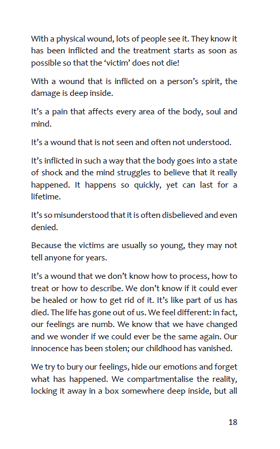 If you are a survivor of abuse, you may have tried many different ways to heal the pain. Some things may have helped a little bit but you know that the pain is still inside. There is hope and my prayer is that, as you read the book, you will come to the realisation that healing can become a reality for you.